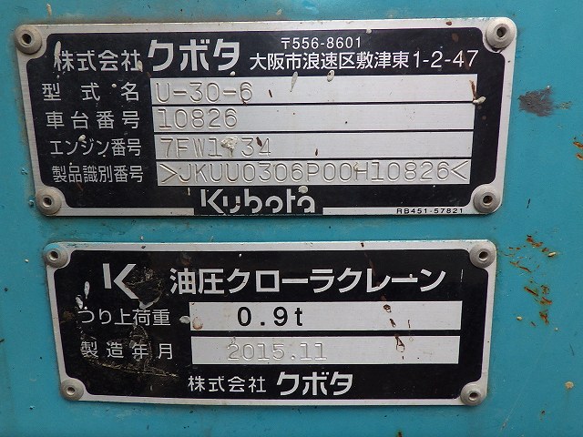 1255005 | KUBOTA | ミニ油圧ショベル | U-30-6 | 10826 | |